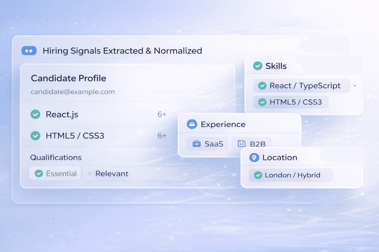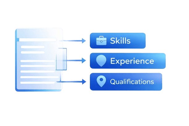 Pull the hiring signals from CVs and job descriptions — skills, experience, industry, location and qualifications — and turn them into structured data you can actually use.