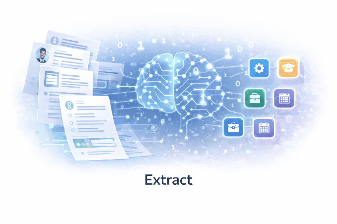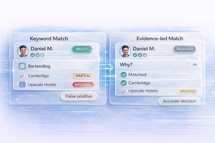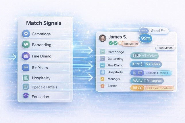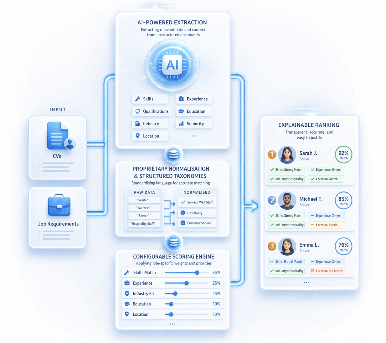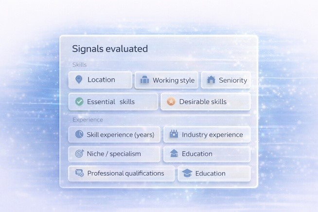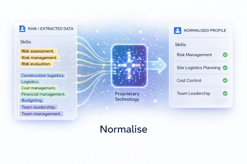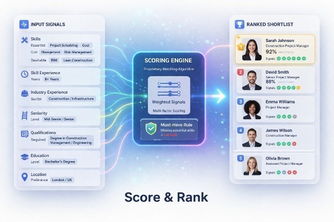 Extract signals from CVs and job requirements, normalise language using proprietary taxonomies, then score and rank candidates against configured requirements.