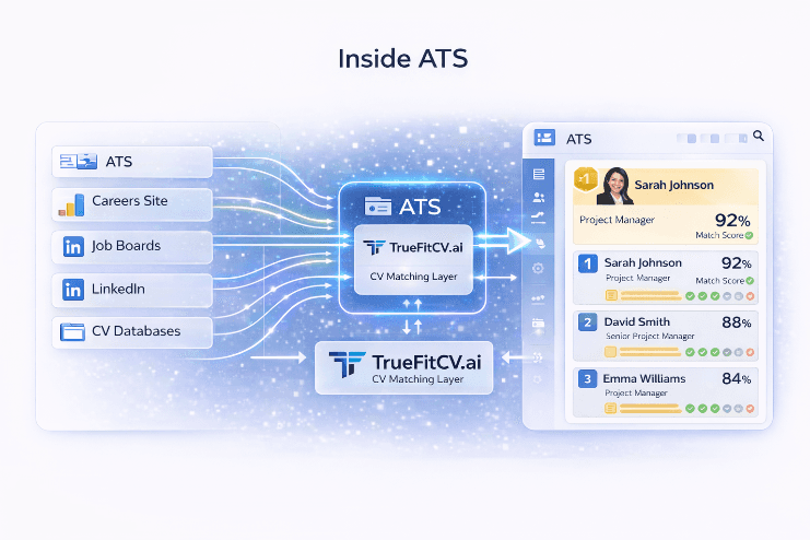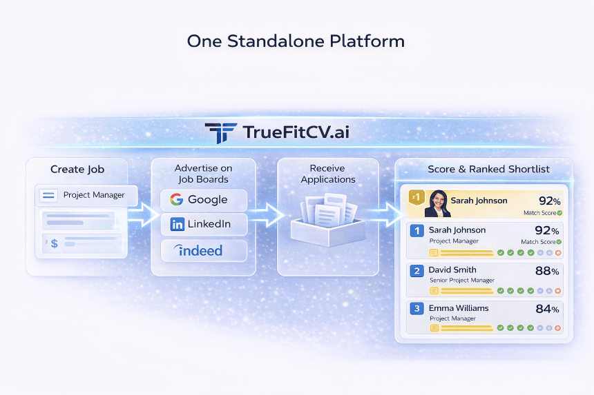 Deploy TrueFitCV.ai inside an ATS as a specialist screening and ranking layer, or use it as a standalone workflow to post jobs, receive applications, and review ranked candidates in one place.