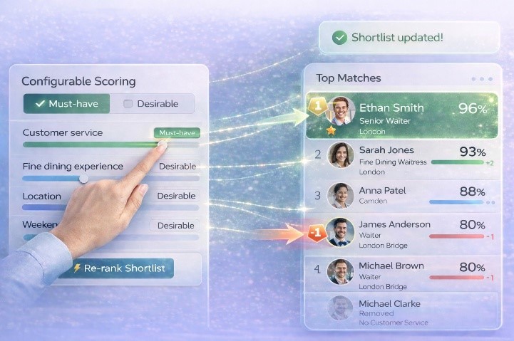 Set global and job-level weighting across skills, experience, qualifications, location, and other signals. Apply must-have vs desirable logic so shortlists reflect how your team actually hires.